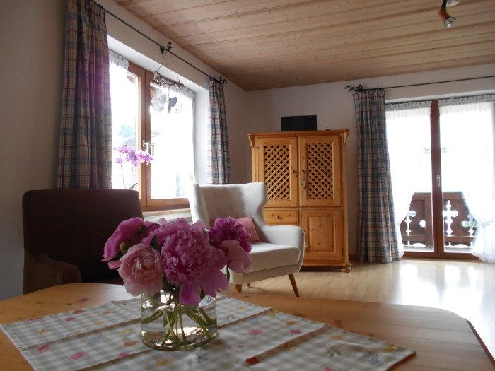 Nichtraucher-Ferienwohnung Karina 3-Zimmer-Wohnung im 1. Stock für 1 - 4 Personen, ca. 89 qm. Umlaufender Süd- und Westbalkon mit Balkonmöbel und herrlicher Aussicht auf das Bergpanorama. Garten mit Liegewiese. Wohnzimmer mit Ecksitzcouch, Sessel, Kabel-Flachbild-TV, Stereoradio, DVD-Player.